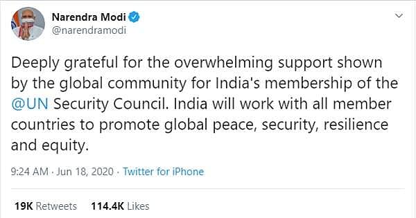 ஐ.நா. பாதுகாப்பு சபையின் நிரந்தரமற்ற உறுப்பினர்களுக்கான காலியாக உள்ள 5 நாடுகளுக்கான தேர்தல் ஐ.நா. தலைமையகத்தில் புதன்கிழமை நடைபெற்றது. இந்த தேர்தலில் ஆசிய -பசிபிக் பிராந்தியம் சார்பில் இந்தியா போட்டியிட்டது. வேறு எந்த நாடும் போட்டியிடாத நிலையில், இந்தியா வெற்றி பெற்றதாக அதிகாரப்பூர்வமாக அறிவிக்கப்பட்டது. 192 உறுப்பினர்களை கொண்ட பாதுகாப்பு சபையில் மூன்றில் இரண்டு பங்கு பெரும்பான்மை 128 ஆகும். இதில் 184 நாடுகள் இந்தியாவிற்கு ஆதரவாகவும், 113 நாடுகள் கென்யாவுக்கு ஆதரவாகவும் வாக்களித்துள்ளன. கனடா தோல்வியடைந்தது.