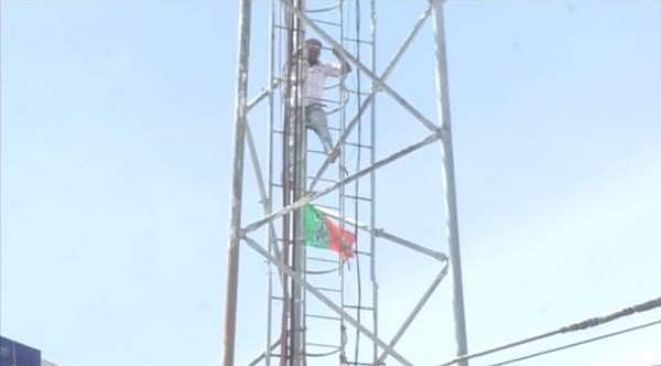 திருப்பூர் புதிய பேருந்து நிலையம் பகுதியில் செல்லிடப்பேசி கோபுரத்தில் ஏறி போராட்டத்தில் ஈடுபட்ட பாஜக தொண்டர்.