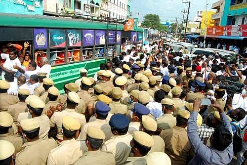 திருத்தணியில் அனுமதியின்றி வேல் யாத்திரையை தொடங்கிய மாநில பாஜக தலைவர் எல்.முருகன், முக்கிய தலைவர்களை காவலர்கள் கைது செய்து பேருந்தில் ஏற்றினர்.