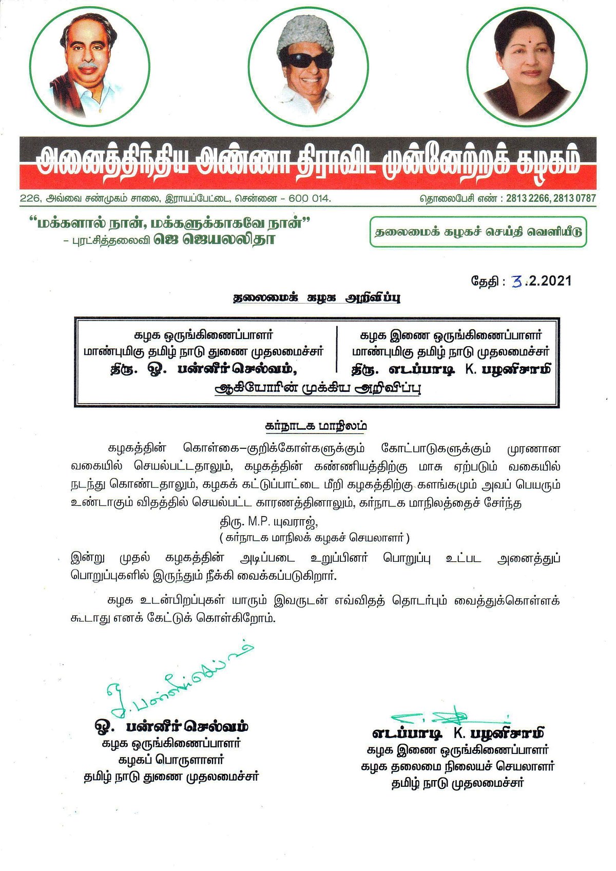கர்நாடக மாநில அதிமுக செயலாளர் யுவராஜை கட்சியின் அடிப்படை உறுப்பினர் உள்பட அனைத்து பொறுப்பிலிருந்தும் நீக்குவதாக கட்சியின் ஒருங்கிணைப்பாளர் மற்றும் இணை ஒருங்கிணைப்பாளர் கூட்டறிக்கையில் தெரிவித்துள்ளனர்.