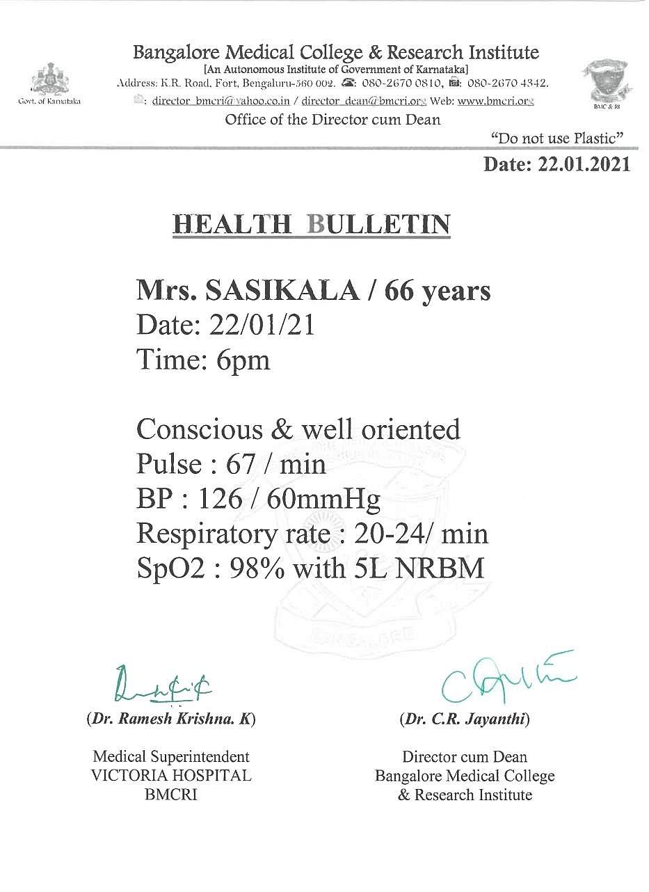 பெங்களூரு விக்டோரியா அரசு மருத்துவமனையில் சிகிச்சை பெற்றுவரும் வி.கே.சசிகலா நலமாக இருப்பதாக மருத்துவமனை அறிக்கை வெளியிட்டுள்ளது.