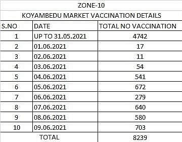 இந்நிலையில், ஜூன் 9 ஒரே நாளில் 703 வியாபாரிகள் தடுப்பூசி செலுத்திக் கொண்ட நிலையில், இதுவரை மொத்தம் 8,239 பேர் தடுப்பூசி போட்டுக் கொண்டுள்ளனர்.