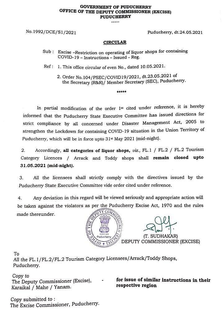 புதுச்சேரியில் உள்ள அனைத்து வகையான உரிமைகளும் கொண்ட மதுக்கடைகள் மே 31ஆம் தேதி வரை மூட வேண்டும். தடையை மீறி கடைகளை திறந்தால் சட்டப்படி கடும் நடவடிக்கை எடுக்கப்படும் எனத் தெரிவித்துள்ளனர்.