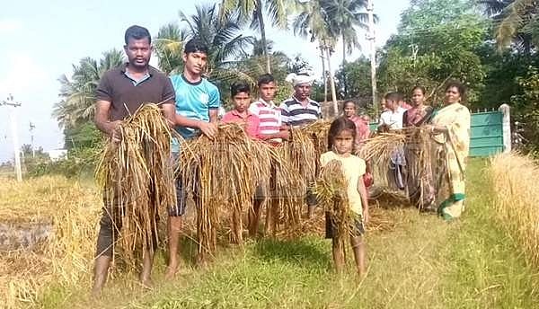 அழுகிய சம்பா பயிர்களைக் குடும்பத்தினருடன் அகற்றும் விவசாயிகள்