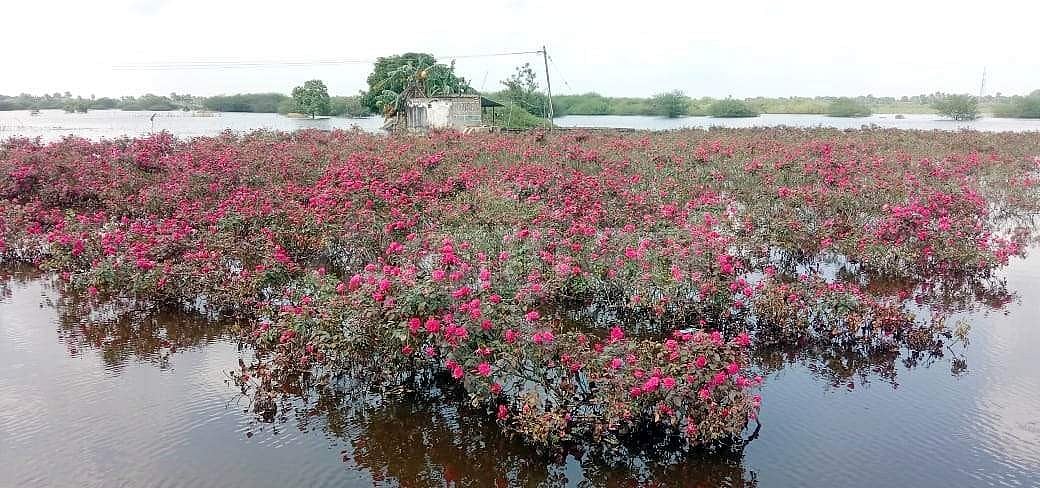 மோரணம் கிராமத்தில் மழை வெள்ளத்தில் மூழ்கியுள்ள பூந்தோட்டப் பயிர்கள்.