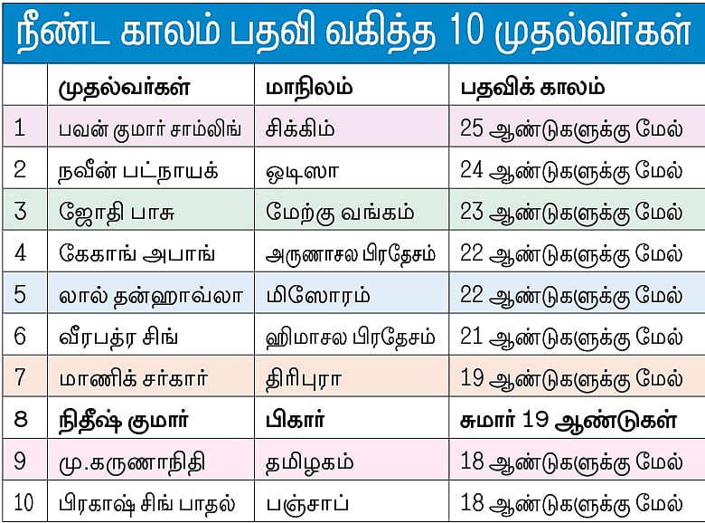 நாட்டில் நீண்ட காலம் பதவி வகித்த 10 முதல்வா்கள் பட்டியலில் 8-ஆவது இடத்தில் பிகாா் முதல்வரும் ஐக்கிய ஜனதா தளம் தலைவருமான நிதீஷ் குமாா் உள்ளாா்.