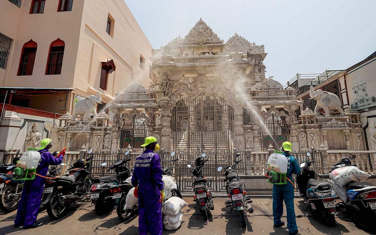 கோயம்புத்தூரில் மொத்த விற்பனைச் சந்தையில் கிருமிநாசினியைத் தெளிக்கும் ஊழியர்கள்.
