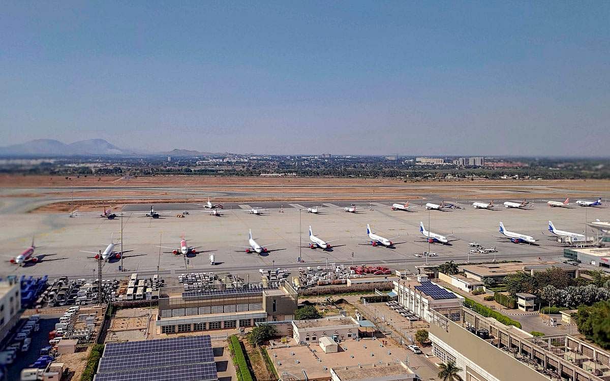பெங்களூரு விமான நிலையத்தில் நிறுத்திவைக்கப்பட்டுள்ள விமானங்கள்.