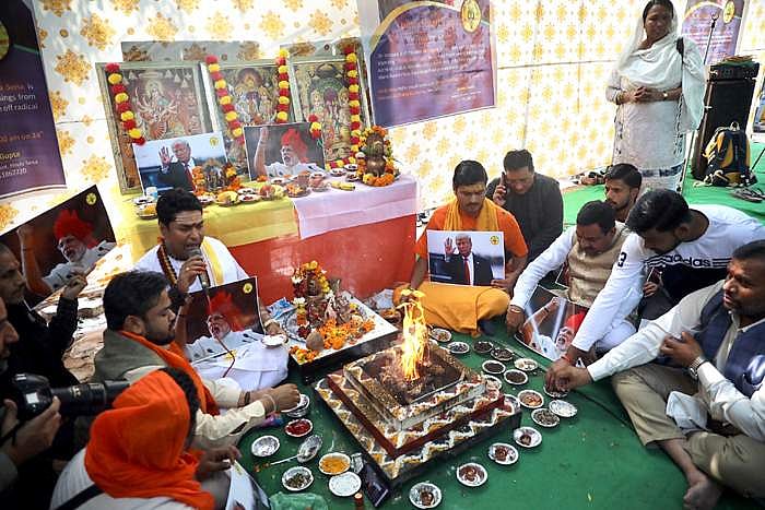 புது தில்லியிலா் அமெரிக்க அதிபர் டிரம்ப், பிரதமர் நரேந்திர மோடி படங்களை வைத்து பூஜை செய்யும் ஹிந்து சேனா அமைப்பினர்.