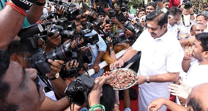 மறைந்த முதல்வர் ஜெயலலிதாவின் பிறந்த நாளில் சென்னைையில் அதிமுக தலைமைக் கழகத்தில் இனிப்புகளை வழங்குபவர் முதல்வர் எடப்பாடி கே. பழனிசாமி.