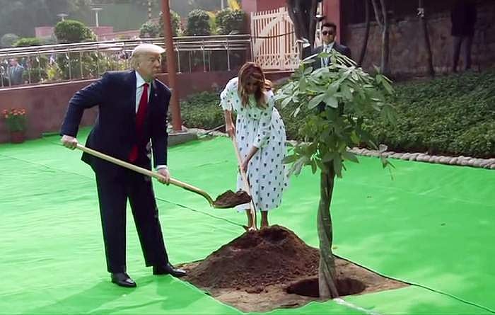 புது தில்லியில் ராஜ்காட்டில் மகாத்மா காந்திக்கு அஞ்சலி செலுத்திய பின் மரக் கன்றை நட்ட அமெரிக்க அதிபர் டொனால்ட் டிரம்ப், அவருடைய மனைவி மெலனியா டிரம்ப்.