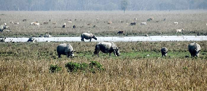 அசாமில் நாகோனிலுள்ள போபிடோரா வனவிலங்கு சரணாலயத்தில் மேய்ந்துகொண்டிருக்கும் ஒற்றைக் கொம்பு காண்டாமிருகங்கள்.