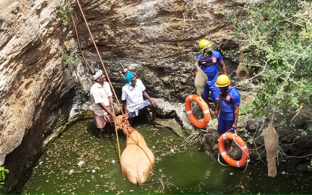 மாட்டின் எடை அதிகமாக இருந்ததால் கிரேன் வரவழைக்கப்பட்டு அதன் மூலமாக கயிறு கட்டி கிணற்றில் இருந்து பசுமாட்டை 2 மணி நேரப் போராட்டத்துக்குப் பிறகு உயிருடன் மீட்டனர்.