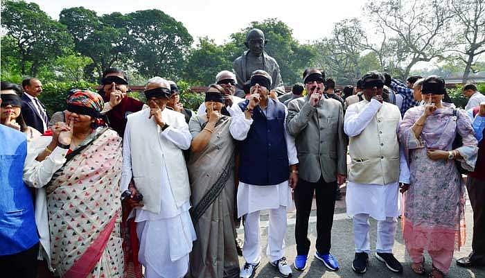 புது தில்லி வன்முறைக்கு எதிர்ப்புத் தெரிவித்து மாநிலங்களவையில் அவைத் தலைவர் இருக்கையைச் சுற்றிவளைத்துப் போராட்டம் நடத்திய எதிர்க்கட்சி உறுப்பினர்கள்.