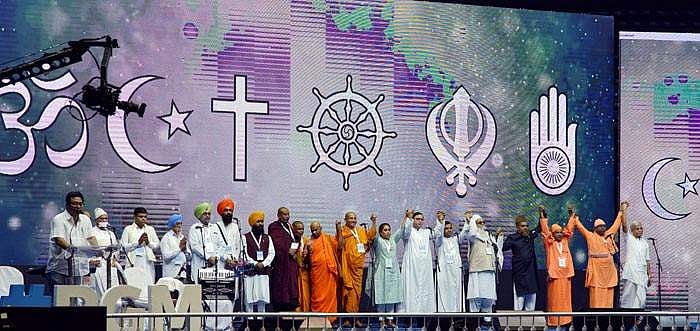 மேற்கு வங்கத் தலைநகர் கொல்கத்தாவில் நேதாஜி அரங்கத்தில் நடந்த மத நல்லிணக்க நிகழ்ச்சியொன்றில் கைகோத்த அனைத்து மதத் தலைவர்கள்.