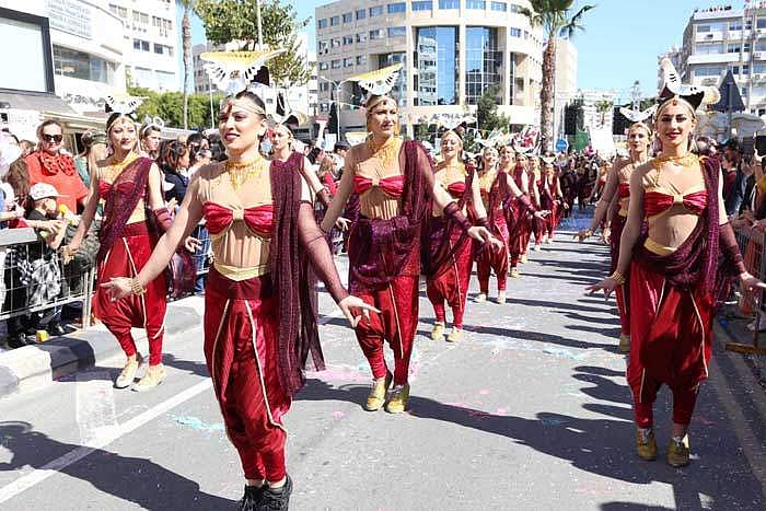 கிழக்கு மத்திய தரைக்கடல் தீவு நாடான சைப்ரஸில் லிமாசோலில் நடைபெறும் விழா அணிவகுப்பில் பங்கேற்ற நடனப் பெண்கள்.