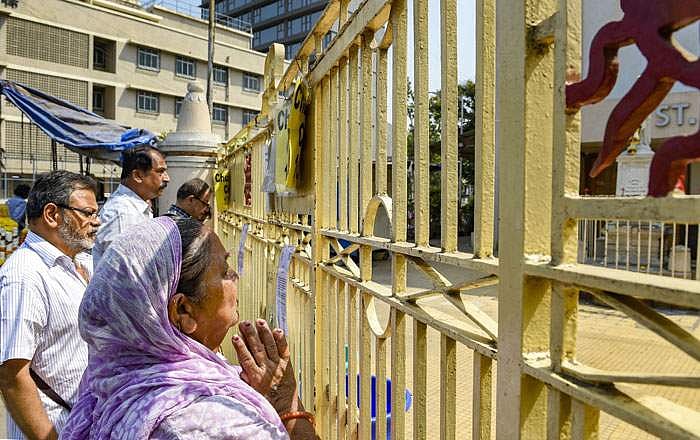 கரோனா அச்சம் காரணமாக மும்பையில் வழிபாட்டுக்கு மூடப்பட்டுவிட்ட நிலையில் புனித மிக்கேல் தேவாலயத்தின் மூடப்பட்ட கதவுகளின் முன் வழிபடும் மக்கள்.