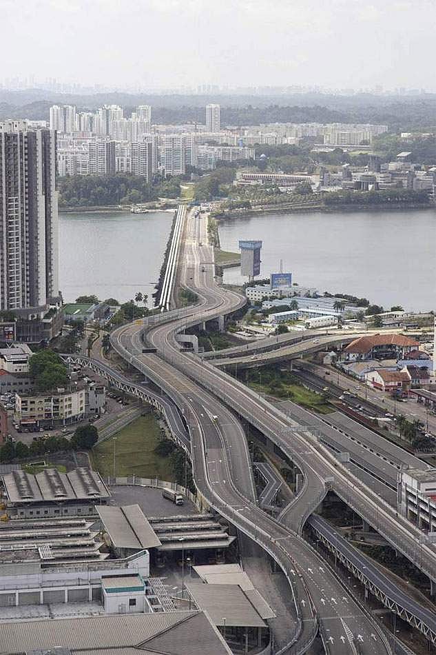 போக்குவரத்து ஏதுமின்றி வெறிச்சோடிக் கிடக்கிறது சிங்கப்பூருடன் மலேசியாவை இணைக்கும் சிங்கப்பூர் பெருவழி (இடம்: ஜோகர் பஹ்ரூ, மலேசியா). தற்காப்பு நடவடிக்கையாக மார்ச் 18 முதல் மக்கள் வந்துசெல்வதைத் தடுக்கும் வகையில் தன்னுடைய எல்லைகளை மலேசிய அரசு மூடிவிட்டது.