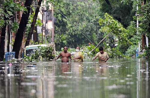 கொல்கத்தாவில் உம்பன் புயலால் வேரோடு மரங்கள் சாய, வீதிகளில் வெள்ளம் புரள நடந்துகடக்கும் மக்கள்.