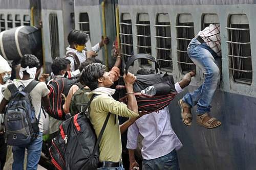 பிகாரில் தானாபூர் ரயில் நிலையத்தில் தங்கள் சொந்த ஊர்களுக்குச் செல்வதற்காக ரயிலேறும் புலம்பெயர் மக்கள்.
