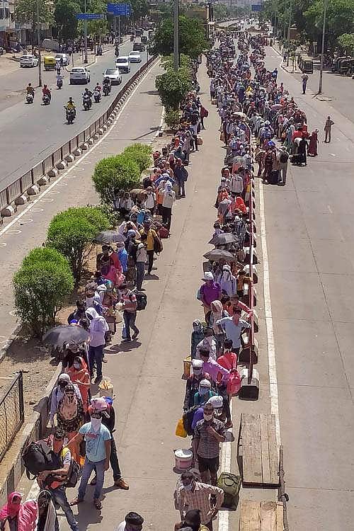 குஜராத்தில் சூரத் நகரில் ரயில் நிலையம் செல்வதற்காக பேருந்துகளில் ஏறக் காத்திருக்கும் புலம்பெயர் தொழிலாளர்கள்.