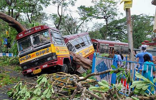 உம்பன் புயல் கரை கடந்த நிலையில் கொல்கத்தா நகரில் விழுந்து கிடக்கும் ஒரு மரத்திற்குக் கீழே சிக்கிச் சின்னாபின்னமான பேருந்து.