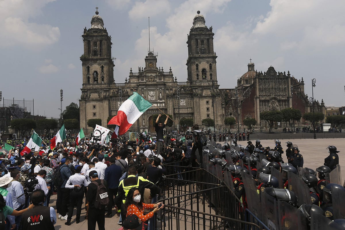 மெக்சிகோ சிடியில் மெக்சிகோ அதிபர் ஆம்லோவின் பதவி விலகலை வலியுறுத்திப் போராடிவரும் ஆர்ப்பாட்டக்காரர்களை நகரின் பிரதான சதுக்கமான ஸொகாலோவுக்குள் நுழையவிடாமல் தடுக்கும் காவல்துறையினர்.