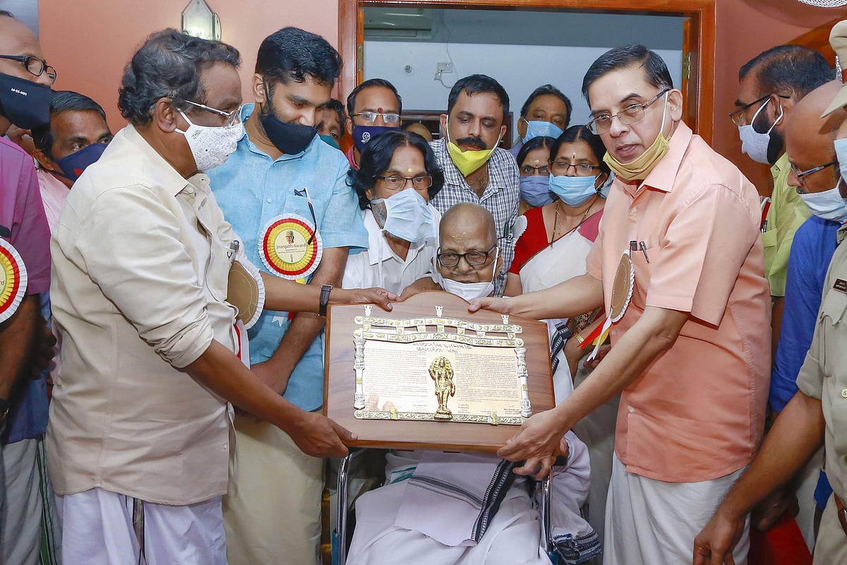 புகழ்பெற்ற மலையாளக் கவிஞரான அக்கிதம் அச்சுதன் நம்பூதிரிக்கு ஞானபீட விருதினைக் கேரளத்தில் பாலக்காட்டிலுள்ள குமாரநல்லூரிலுள்ள அவருடைய இல்லத்தில் வியாழக்கிழமை வழங்குகிறார் கேரள பண்பாட்டுத் துறை அமைச்சர் ஏ.கே. பாலன் (இடது).