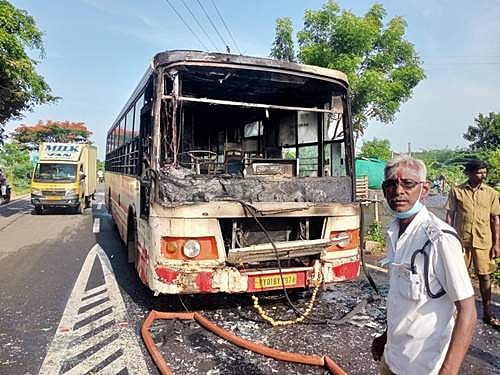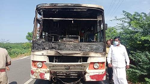தீ பிடித்து முழுவதும் எரிந்து நிலையில் புதுச்சேரி அரசு பேருந்து