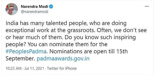 இதுதொடர்பாக பிரதமா் நரேந்திர மோடி தனது சுட்டுரையில் கூறியிருப்பதாவது: அடிமட்ட அளவில் தன்னிகரற்ற சேவையை அளிக்கும் ஏராளமான திறமைவாய்ந்த துடிப்பானவர்கள் இந்தியாவில் உள்ளனர். அவர்களைப் பற்றி நாம் அடிக்கடி கேள்விப்பட்டதோ அல்லது கண்டிருக்கவோ இல்லை. இதுபோன்று ‘உங்களால் ஈா்க்கப்பட்டு பெரிதும் பிரபலம் அடையாத திறமைவாய்ந்த அபூா்வ நபா்களை பத்மா விருதுகளுக்கு சிபாரிசு செய்யுங்கள்.‘ பத்மா விருதுகளுக்கான சிபாரிசு செப்டம்பர் 15-ஆம் தேதி வரை ஏற்றுக் கொள்ளப்படும். இதற்கான விண்ணப்பப்படிவத்தை https://padmaawards.gov.in பதிவேற்றம் செய்துக்கொள்ளலாம் என்றும் தெரிவித்துள்ளார்.