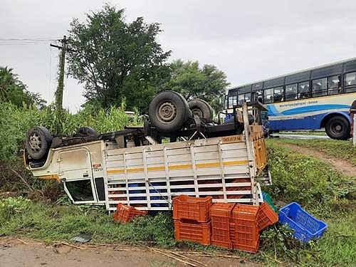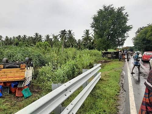 மழையின் காரணமாக பிரேக் போட்டபோது நிலக்கரி லாரி தலைகுப்புற கவிழ்ந்து கிடக்கும் வாகனங்கள்.