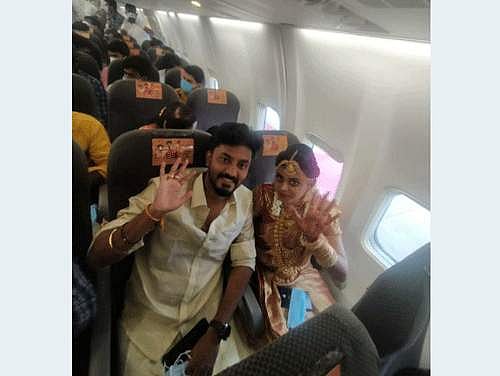 இந்நிலையில், இவர்களின் திருமணத்தை வித்தியாசமான முறையில் நடத்த திட்டமிட்ட பெற்றோர்கள், மதுரையிலிருந்து தூத்துக்குடிக்கு தனியார் விமானம் ஒன்றை (வாடகைக்கு) முன்பதிவு செய்தனர். அதன்படி ஞாயிற்றுக்கிழமை காலை 7.30 மணியளவில் 161 பயணிகளுடன் அந்த விமானம் மதுரையிலிருந்து தூத்துக்குடிக்கு புறப்பட்டது. இதில் மகமகன் மற்றும் மணமகளின் உறவினர்களுக்கு மட்டும் பிரத்தோகமாக அனுமதிக்கப்பட்டனர்.(வெளிநபர்களுக்கு அனுமதியில்லை). விமானத்தில் சென்ற அனைவருக்கும் கரோனா பரிசோதனை செய்து கரோனா தொற்று இல்லை என்பதை உறுதிபடுத்தியபின் அனுமதிக்கப்பட்டனர்.