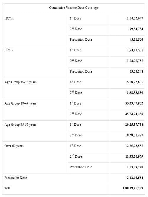 இன்று காலை 7 மணி நிலவரப்படி, 2,10,99,040 தடுப்பூசி மையங்கள் மூலம் இதுவரை 1,80,19,45,779 (180.19 கோடி) கரோனா தடுப்பூசி டோஸ்கள் போடப்பட்டுள்ளது.