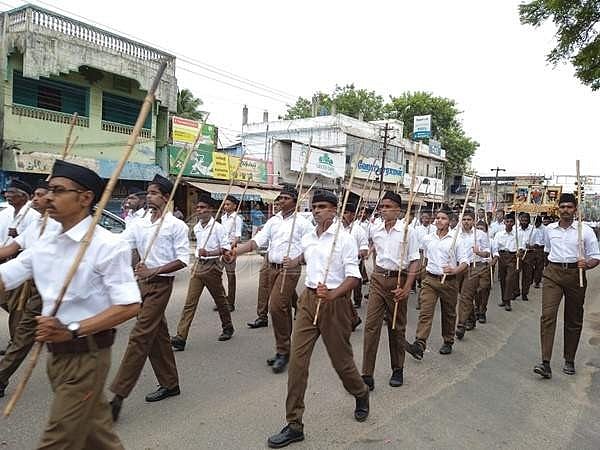 அணிவகுப்பாக சென்ற சீருடை அணிந்த ஆர்எஸ்எஸ் தொண்டர்கள்