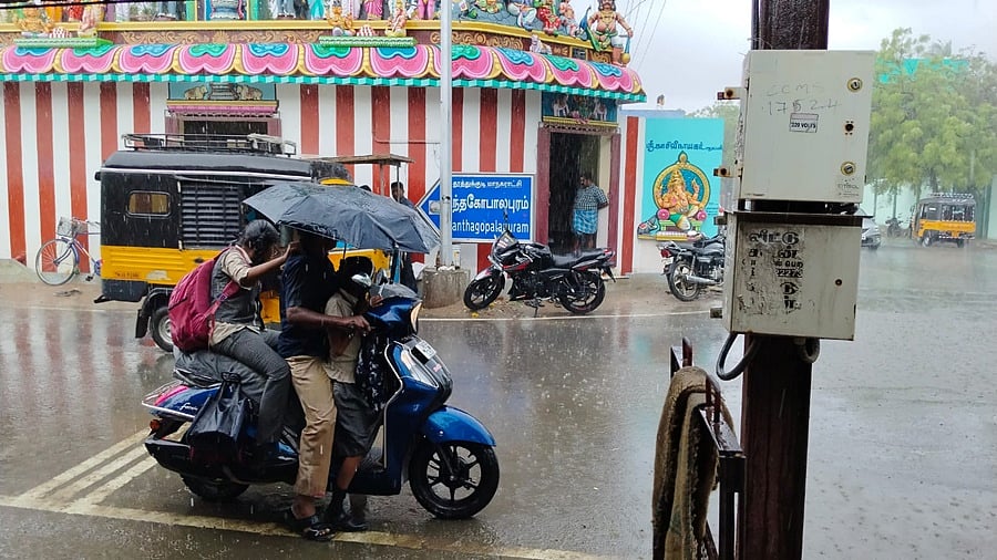 மழை காரணமாக குடைபிடித்தபடி இருசக்கர வாகனத்தில் பள்ளி செல்லும் மாணவர்கள்