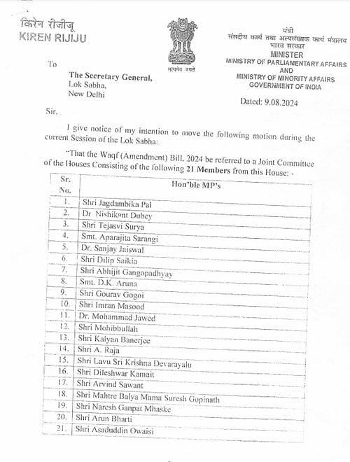 31 பேர் கொண்ட கூட்டுக்குழுவை மத்திய சிறுபான்மையினா் விவகாரங்கள் துறை அமைச்சா் கிரண் ரிஜிஜு அமைத்துள்ளார். மக்களவையில் நேற்று(ஆக. 8) வக்ஃப் வாரிய அதிகாரங்களை திருத்தம் செய்யும் மசோதாவை மத்திய அமைச்சர் கிரண் ரிஜிஜு தாக்கல் செய்தார்.