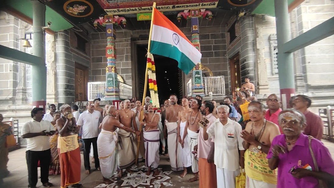 சிதம்பரம் நடராஜர் கோயில் கிழக்கு கோபுரத்தில் ஏற்றப்பட்ட தேசியக்கொடி