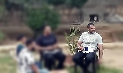சிறையில் நாற்காலியில் அமர்ந்தபடி கையில் தேநீர்க் கோப்பை, சிகரெட் உடன் தர்ஷன்