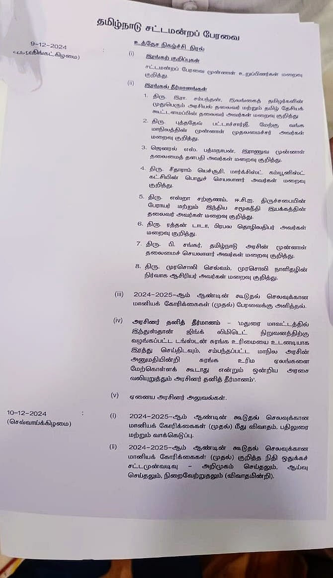 தமிழக சட்டப்பேரவை நிகழ்ச்சி நிரலில், “மதுரை மாவட்டத்தில் இந்துஸ்தான் ஜிங்க் லிமிடெட் நிறுவனத்திற்கு வழங்கப்பட்ட டங்ஸ்டன் சுரங்க உரிமையை உடனடியாக ரத்து செய்திடவும், சம்பந்தப்பட்ட மாநில அரசின் அனுமதியின்றி சுரங்க உரிம ஏலங்களை மேற்கொள்ளக் கூடாது என்றும் மத்திய அரசை வலியுறுத்தும் அரசின் தனித் தீர்மானம் கொண்டு வரப்படும்” என்று தெரிவிக்கப்பட்டுள்ளது.