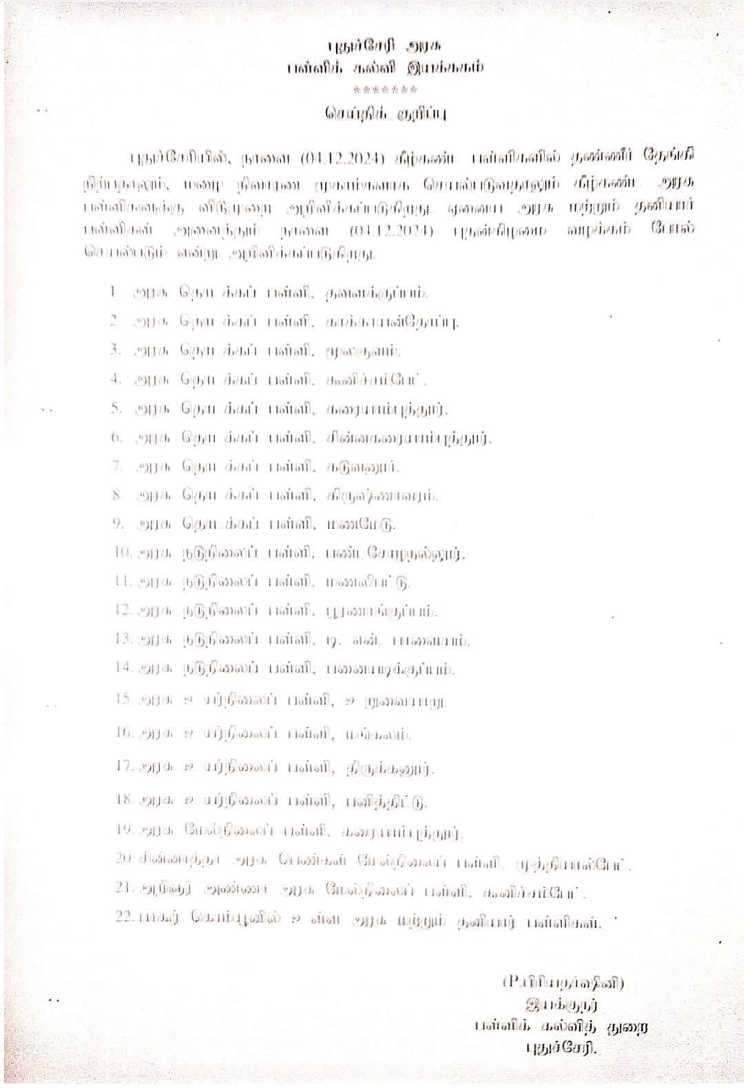 அதேபோல், புதுவையில் மழை வெள்ள பாதிப்பால், நிவாரண முகாமாக மாற்றப்பட்டுள்ள பள்ளிகளுக்கு நாளை விடுமுறை அறிவிக்கப்பட்டுள்ளது. மற்ற அரசு மற்றும் தனியார் பள்ளிகள் வழக்கம்போல் செயல்படும் என்று தெரிவிக்கப்பட்டுள்ளது.