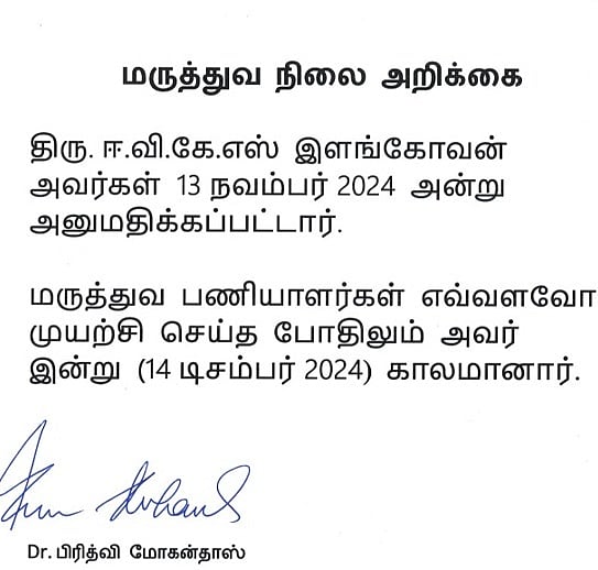 காங்கிரஸ் கட்சியின் மூத்த தலைவரும், ஈரோடு கிழக்கு தொகுதி சட்டப்பேரவை உறுப்பினருமான ஈவிகேஎஸ் இளங்கோவன் காய்ச்சல் பாதிப்புக்காக கடந்த நவம்பர் 11-ஆம் தேதி சென்னை மணப்பாக்கத்தில் உள்ள மியாட் மருத்துவமனையில் அனுமதிக்கப்பட்ட அவருக்கு நுரையீரல் சாா்ந்த பாதிப்பு இருப்பது உறுதி செய்யப்பட்டு, அதற்காக சிகிச்சை அளிக்கப்பட்டது.