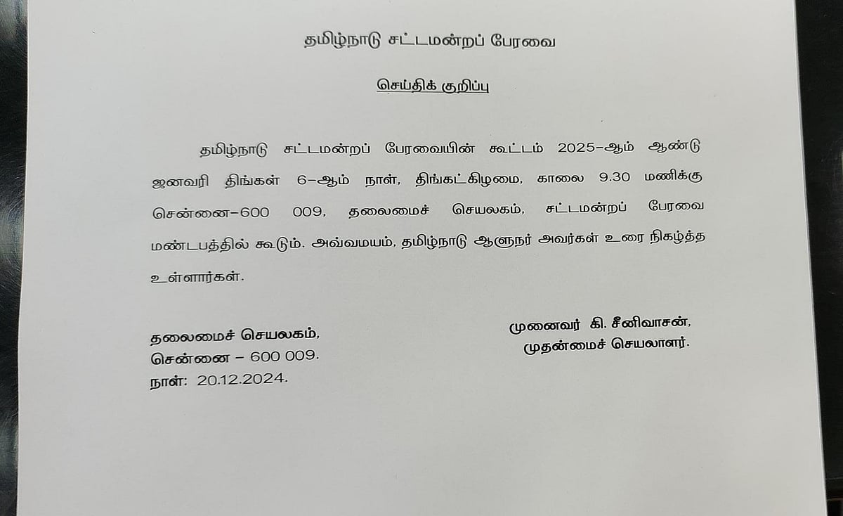 இது தொடர்பாக தமிழக அரசு வெளியிட்ட செய்திக் குறிப்பில், “தமிழ்நாடு சட்டமன்றப் பேரவையின் கூட்டம் 2025-ஆம் ஆண்டு ஜனவரி 6-ஆம் நாள், திங்கள்கிழமை, காலை 9.30 மணிக்கு தலைமைச் செயலகத்தில் உள்ள சட்டமன்றப் பேரவை மண்டபத்தில் கூடும். அப்போது, தமிழ்நாடு ஆளுநர் ஆர்.என். ரவி உரை நிகழ்த்த உள்ளார்” என்று தெரிவிக்கப்பட்டுள்ளது.