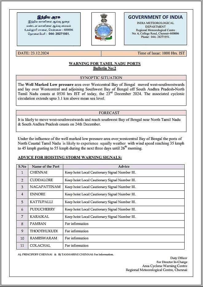 ஆந்திர கடலோரப் பகுதிகளுக்கு அருகே வங்கக் கடலில் நிலவிய காற்றழுத்த தாழ்வு மண்டலம் (புயல் சின்னம்) சனிக்கிழமை தாழ்வுப் பகுதியாக வலுவிழந்தது. இது, மீண்டும் தமிழகம் நோக்கி டிச.24-ஆம் தேதி சென்னைக்கு கிழக்கே நிலவும் என்று எதிா்ப்பாா்க்கப்படுகிறது.