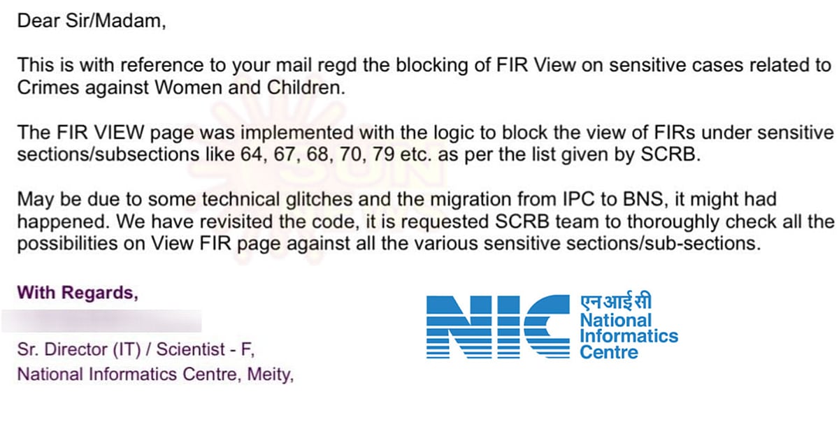'ஐபிசி சட்டமானது, பிஎன்எஸ் சட்டமாக மாறும்போது எஃப்ஐஆர் தானாகவே முடக்கப்பட்டுவிடும். அப்படி மாறும்போது தாமதமானதால் அந்த நேரத்தில் ஒரு சிலர் எஃப்ஐஆரை பதிவிறக்கம் செய்திருக்கலாம். பாதிக்கப்பட்டவருக்கு ஒரு நகல் வழங்கப்படும், அதன்வழியாகவும் இணையத்தில் கசிந்திருக்கலாம்' என்று கூறியிருந்தார்.