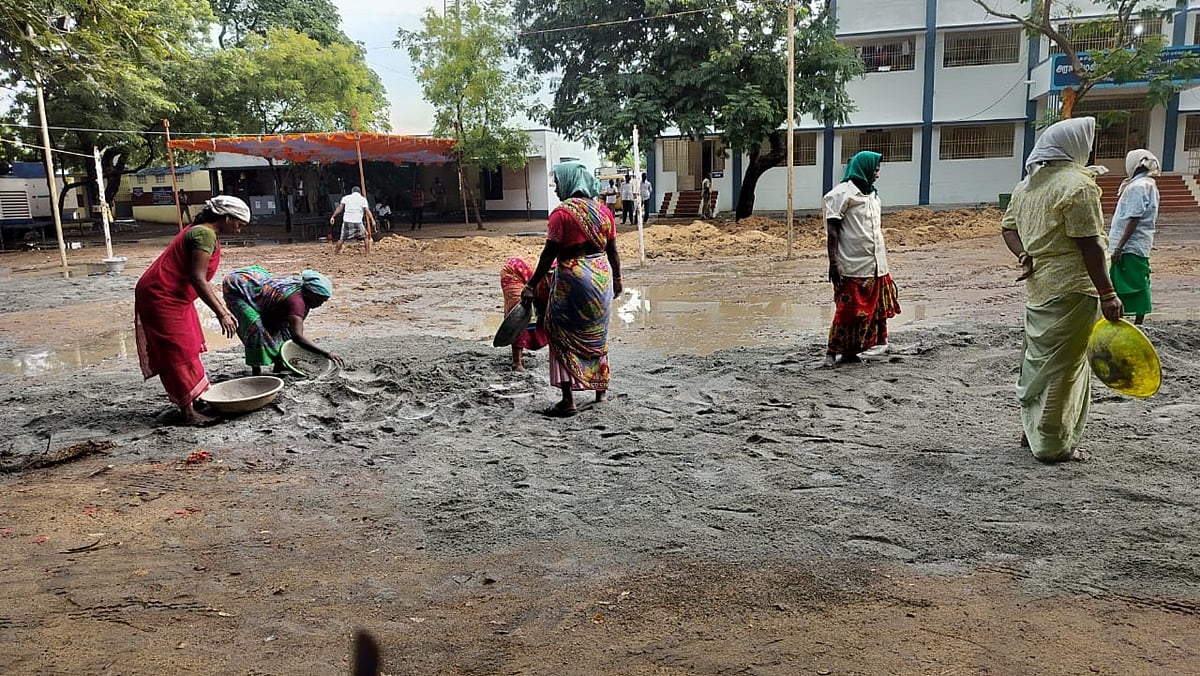 வாக்கு எண்ணும் மையத்தின் உள் பகுதியில் தேங்கிய மழைநீர் மீது மண்ணைக் கொட்டி சமன்படுத்தும் பெண்கள்.