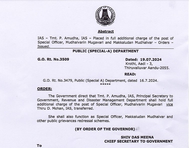 வருவாய், பேரிடர் மேலாண்மைத்துறை செயலரான அமுதா ஐஏஎஸ்-க்கு கூடுதல் பொறுப்பு வழங்கப்பட்டுள்ளது. முதல்வரின் முகவரி திட்டம், மக்களுடன் முதல்வர் திட்ட சிறப்பு அதிகாரியாக அமுதா ஐஏஎஸ் செயல்படுவார் என்று தெரிவிக்கப்பட்டுள்ளது.