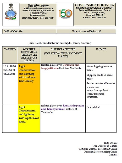 தென்னிந்திய பகுதிகளில் வளிமண்டல மேலடுக்கு சுழற்சி நிலவுகிறது. இதனால், தமிழகத்தில் ஒருசில இடங்களிலும், புதுச்சேரி மற்றும் காரைக்கால் பகுதிகளிலும் வியாழக்கிழமை (ஜூன் 6) முதல் ஜூன் 9 வரை இடி மின்னல் மற்றும் பலத்த காற்றுடன் மிதமான மழை பெய்ய வாய்ப்புள்ளது.