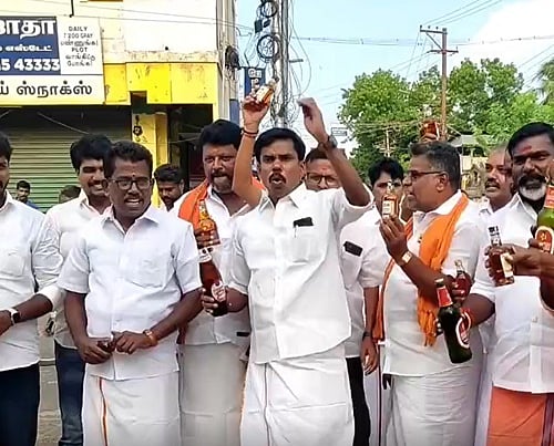 இதேபோல், தஞ்சாவூர் மாவட்டம் கும்பகோணம் ரயில் நிலைய சாலையில் உள்ள அரசு டாஸ்மாக்கில் இருந்து மது பாட்டில்களை வாங்கி ஊர்வலமாக வந்த பாஜகவினர், மதுவை கீழே கொட்டி நூதன ஆர்ப்பாட்டத்தில் ஈடுபட்டனர்.