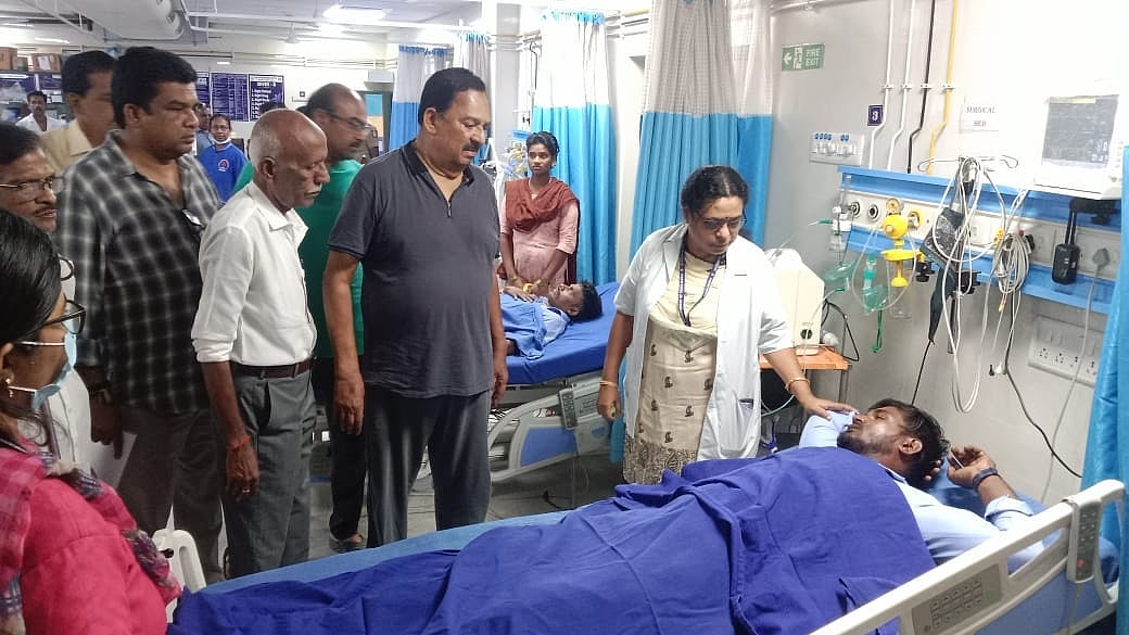 வாலாஜாப்பேட்டை அருகே தனியார் தொழிற்சாலை பேருந்து விபத்துக்குள்ளானதில் 18 தொழிலாளர்கள் படுகாயமடைந்தனர். தகவல் அறிந்து அமைச்சர் ஆர்.காந்தி, ஆட்சியர் ச.வளர்மதி ஆகியோர் மருத்துவமனைக்கு விரைந்து சென்று பார்வையிட்டு ஆறுதல் கூறி பாதிக்கப்பட்டவர்களுக்கு உடனடி சிகிச்சை அளிக்க மருத்துவர்களை கேட்டுக்கொண்டனர்.