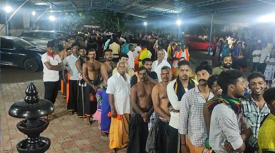 அதிகாலை முதலே மாலை அணிவதற்காக நீண்ட வரிசையில் காத்திருந்த ஏராளமான பக்தா்கள்.